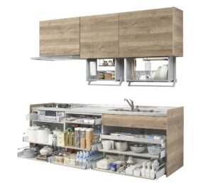 シンクキャビネット内に、ハサミや計量カップといった調理小物を立体的に整理できる「スライドボックス」などを設置可能。