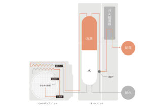 電気の力(ヒートポンプ)で、夜間の割安な電力を使い、空気中の熱を取り込んで効率よくお湯を沸かし、貯湯タンクに貯めます。(主にここが節約のポイント!)そして、 貯湯タンクのお湯が足りなくなった時や、急な大量出湯の時に、ガスで瞬時にバックアップします。この「主に効率の良い電気で沸かし、ガスでパワフルにサポートする」仕組みにより、従来のガス給湯器よりも格段に少ないエネルギーで、一年中安定してお湯を供給できます。